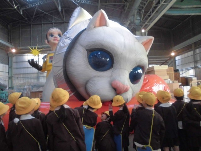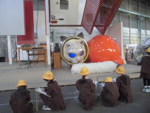 「MASK(MEGA ART STORAGE KITAKAGAYA)」は、大型の現代アート作品を保管・展示する倉庫です。1年生が見学に招待され、子どもたちは倉庫のシャッターが開く前からワクワクしていました。実際に中に入ると、とても大きな作品を興味深く見ることができました。