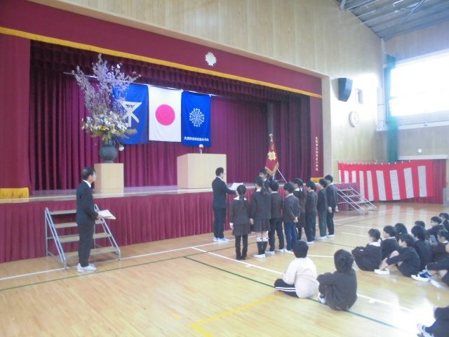 校長先生から代表の児童に修了証が手渡され、この一年間の頑張りや成長についてお話がありました。子どもたちは、堂々とした態度で式に臨んでいました。