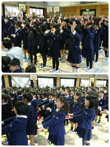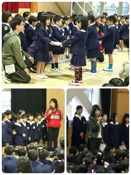 1年生に校歌を覚えてもらえるようにみんなで歌いました。そして「ともだちになるために」の歌もプレゼントをしました。