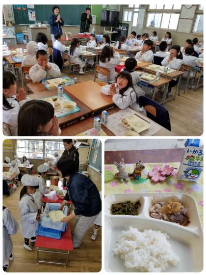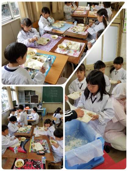 今日の給食は、ごはん、牛乳、豚肉のおろしじょうゆかけ、みそ汁、じゃこピーマンでした。豚肉のおろしじょうゆかけは、おろしじょうゆが豚肉と合っていました。じゃこピーマンは、ピーマンが苦手の児童も「これ、おいしい。」と言って食べていました。