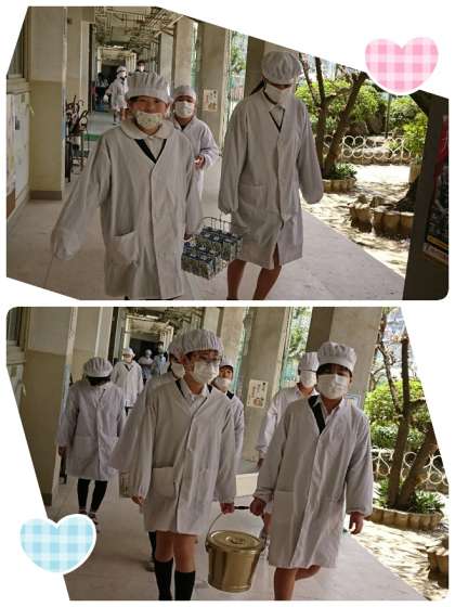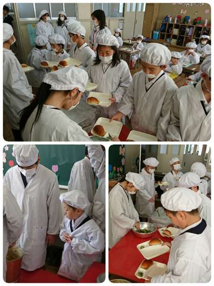 最初は全て、6年生が準備をしてくれていたのですが、今日からは、1年生も覚えるために6年生と一緒に少しだけ当番のお仕事に挑戦しました。