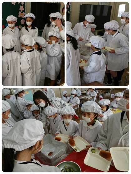 1年生と6年生が並んで給食当番をしていると、なんとも微笑ましいです。6年生の優しさが1年生に伝わって、ほんわりあたたかい雰囲気です。