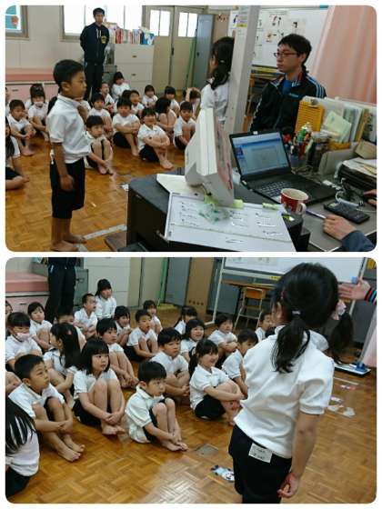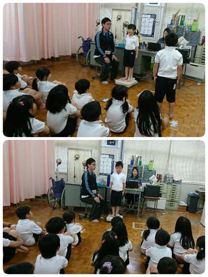 その後、今日は、身長と体重を測りました。出席番号順に測定しました。身長体重計がウィーンという音を立てて下りてくると、子ども達はなんだか楽しくなってクスクス笑います。測定するたびにウィーンと音が鳴り、その都度子ども達のクスクスが最後まで止まりませんでした。(^_^;)