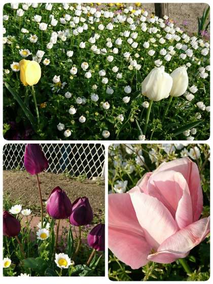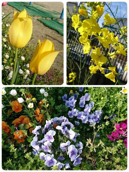 今日は、朝からお天気がよくて、校庭を回っていると、学校のあちこちで春をいっぱい感じます。学校のプール前の花だんもチューリップやビオラ、ノースポールなどの花が満開で、とてもきれいです。