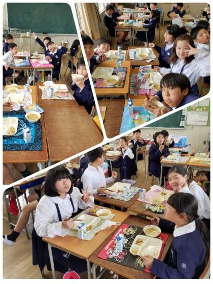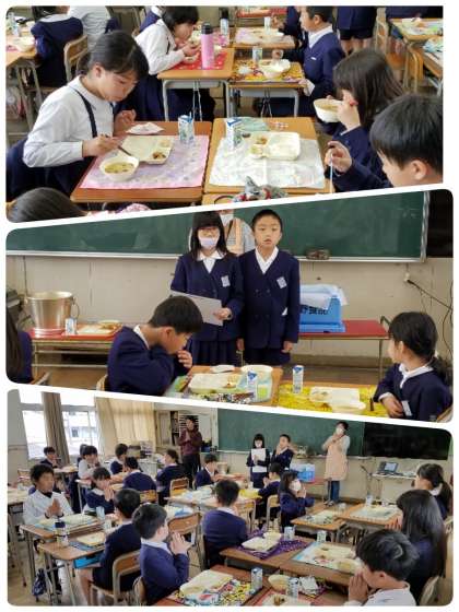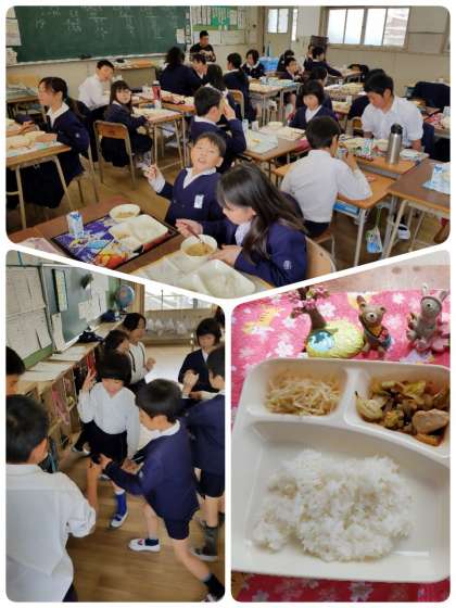 今日の給食は、ごはん、牛乳、焼きとり、みそ汁、もやしのゆずの香あえでした。焼きとりは、たれが甘くておいしかったです。みそ汁は、具だくさんで、じゃがいもがホクホクしていました。もやしのゆずの香あえは、さっぱりとしていました(^.^)