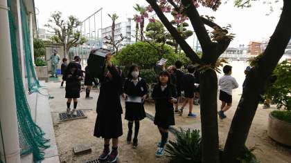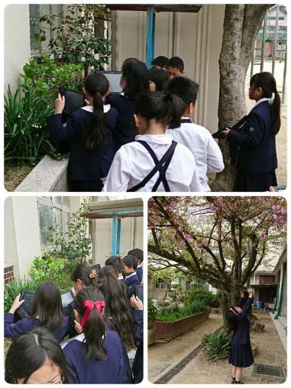 前回に引き続き、タブレットを使って春の植物を観察記録しました。今回は、満開のヤエザクラ、まだつぼみの状態のツツジ、アジサイなどです。1年間を通して観察し、植物の変化を見ていく予定です。