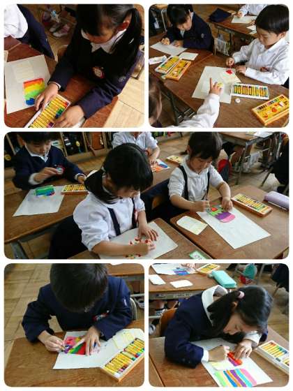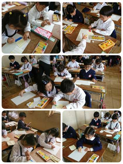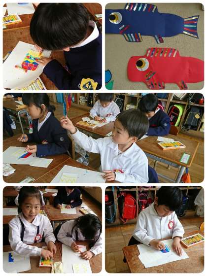 1−1の子ども達が、こいのぼりのうろこの色塗りをしていました。いろいろなうろこができるようにパスを使って模様や塗り方を工夫して丁寧に塗り込んでいました。