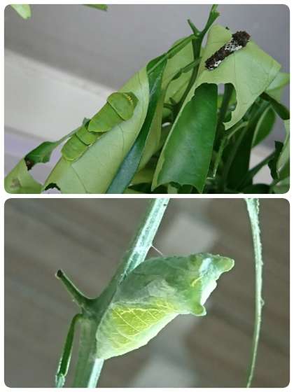 3年生が大切に飼育・観察しているモンシロチョウとアゲハチョウの幼虫がサナギに変身しました。小さいサナギがモンシロチョウ(☆マークがついている写真)で、大きい方がアゲハチョウのサナギです。アゲハの幼虫はサナギになる前にサナギになりやすい場所を探して移動するのですが、1匹のサは大冒険をしたようで、廊下の側面の下のほうでサナギになっていました。全校朝会で3年生の先生からこのサナギについてのお話があり、子ども達も気をつけて廊下を歩いています。いつ羽化するのか、みんなワクワクです。