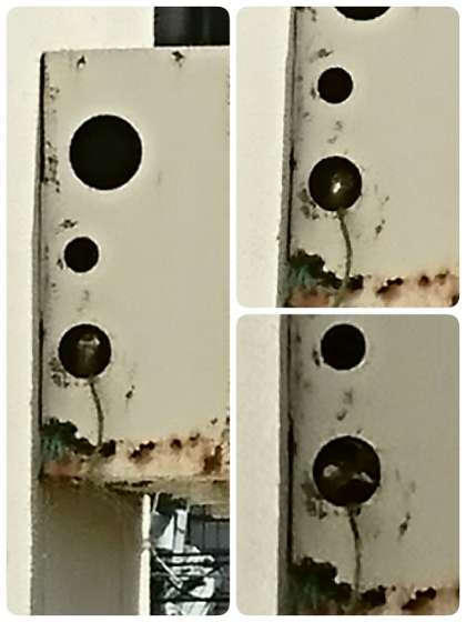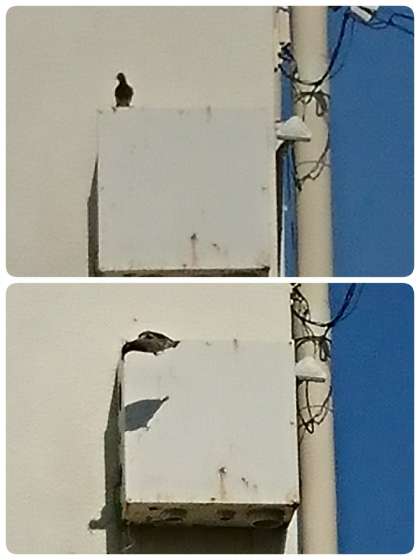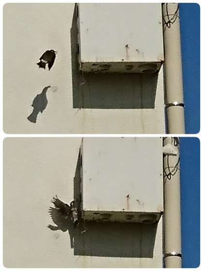 今日は、ボックスの出入り口からヒナが顔をのぞかせていました。3枚目の写真の左側は、ヒナが右側を向いています。右側上は、斜め下をのぞき込んでいる様子、右側下は、左側に親鳥がいて、右側にヒナが口をあけています。白っぽく写っているのがくちばしです。写真では分かりにくいのですが、体もかなり大きく育ってきていますよ。!(^^)!