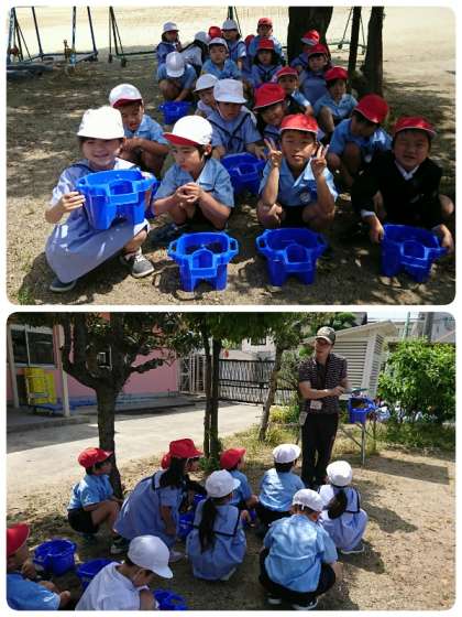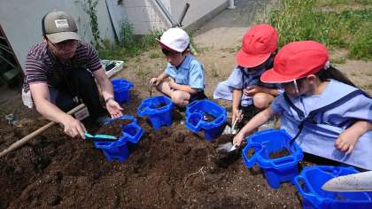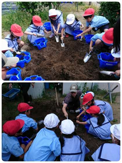 1年3組の子ども達が、アサガオの種をまくために、植木鉢の準備をしていました。先生の説明をしっかり聞いて、順番に植木鉢に土を入れました。アサガオの種のふかふかベッドができあがりました。
