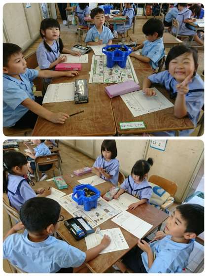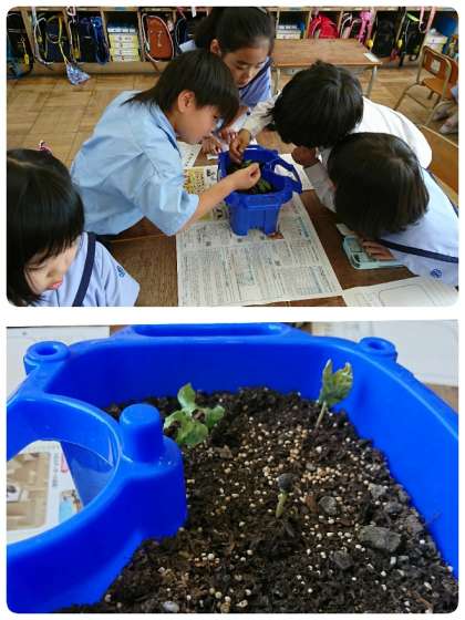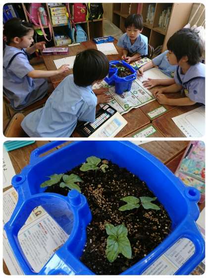先日植えたアサガオのフタバがたくさん出てきました。今日はみんなでアサガオの葉っぱを観察して、カードに見つけたことと絵を描きました。
