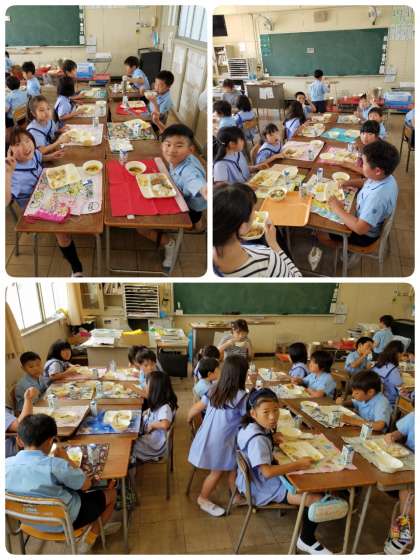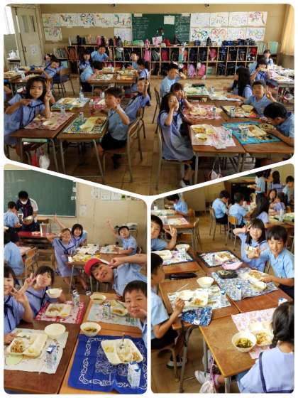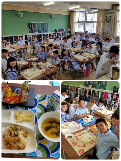 今日の給食は、ごはん、牛乳、豚丼、湯葉のすまし汁、焼きじゃがでした。豚丼は、多くの児童がおかわりをしていました。焼きじゃがも人気でした。湯葉のすまし汁は、たけのこがアクセントになっていて、おいしかったです(^◇^)
