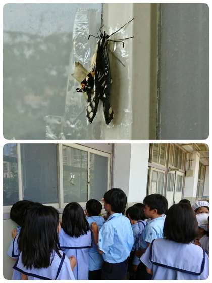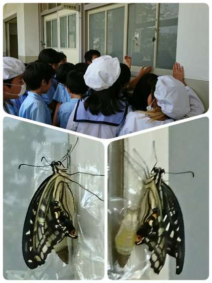 給食の前に職員室に子ども達が飛び込んできました。子ども達はとってもうれしそうにしています。さっそく子ども達と生まれたてのアゲハチョウを見に行きました。たくさんの子どもが集まって、アゲハの観察をしていました。本当についさっき羽化したばかりのようで、羽はまだくしゅっとしています。飛び立っていくにはもう少し時間がかかりそうです。子ども達と一緒にアゲハチョウの誕生をお祝いしました。(*^^)v