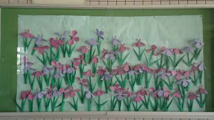 6月の玄関掲示は菖蒲です。立体的に作ってあってとてもステキです。