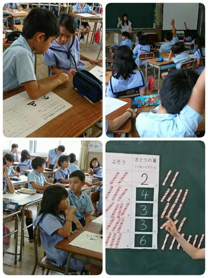住之江区内の栄養教諭に来てもらって、3年生の子ども達が「おやつについて考えよう」という学習をしました。まず、普段食べているおやつには、砂糖が使われているものが多いことに気づくことができました。次に、砂糖をとりすぎると、「虫歯になりやすい」「つかれやすい」「太りやすい」ことが分かりました。最後に、いろいろなおやつや飲み物(ドーナツ1個50g、チョコレート1枚50g、アイスクリーム1個80g、プリン1個80g、スポーツ飲料1本500ml)にはどのくらい砂糖が入っているのか、5gのスティック砂糖を基準にして予想しました。さて、その結果は・・・子ども達の予想とは違って、なんとスポーツ飲料には6本(30g)の砂糖が入っていることが分かりとてもびっくりしていました。おやつの選び方や量などについて考えることができた学習でした。
