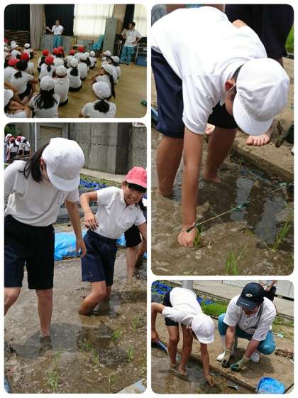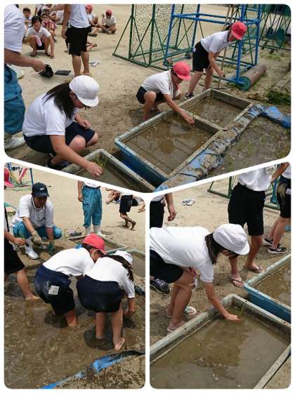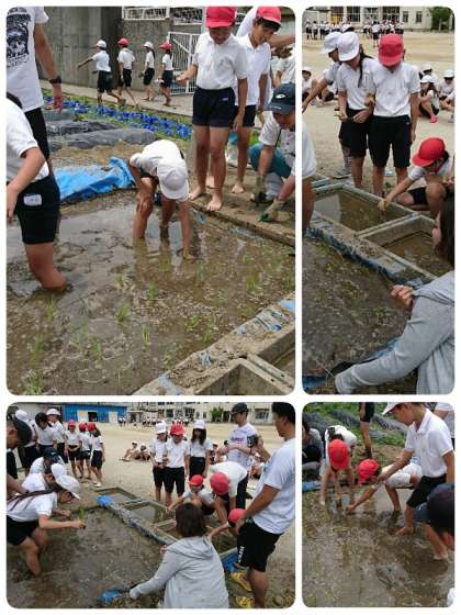JA大阪市の方に来ていただいて、5年生の子ども達が田植えをしました。毎年米づくりに挑戦していますが、米が実るころにすずめがやってきて食べてしまうことが多く、収穫するのが難しいです。今年はいつものプランターやバケツだけではなく、小さい田んぼも作りました。米づくりの先生から苗の植え方を教えてもらい、みんなが少しずつ田植えを経験しました。田んぼに入ると意外と深い?やわらかい?場所があってびっくりしている子どももいました。さて、今年の収穫はどうなることやら。楽しみですね。