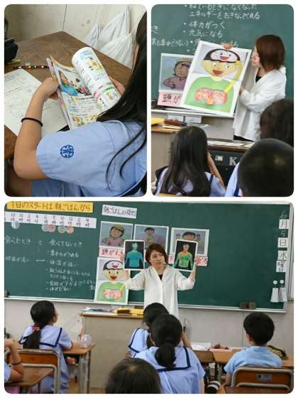 今日は5年生の子ども達が「1日のスタートは朝ごはんから」という学習をしました。1日の生活を大まかに振り返り、朝ごはんを食べたときと食べなかった時の違いについて話し合いました。朝食をとると「集中できる」「元気が出る」「体温が上がる」「うんちが出やすい」、食べない時は「ボーっとする」「やる気が出ない」「集中力がきれる」などの意見が出ました。子ども達はよく分かっていますよね。それではどんな朝食を食べるとよいのかということについても考えました。