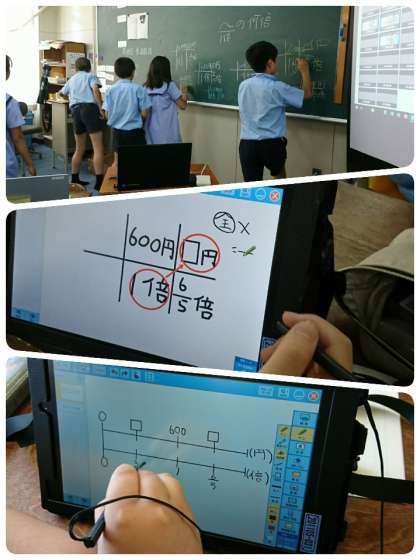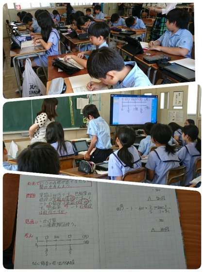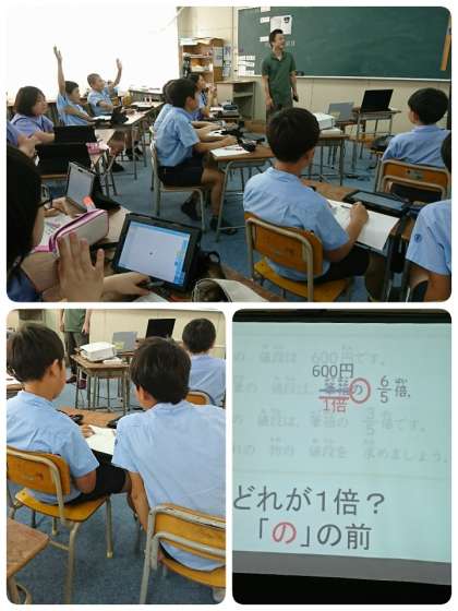 2時間目に6−1の算数科「分数のわり算を考えよう」の授業を見てきました。住吉川小学校では、3年生以上の学年で、算数の学習を習熟度に分かれて行っています。本時の目標は、「○倍を表す数に着目し立式する」です。どちらのコースも問題文をしっかり読み、何を聞かれているのかを考えて問題に取組んでいました。タブレットに自分の考えを書き込んだり、友達と意見交流をしたりしながら学習していました。集中してがんばっていましたよ。