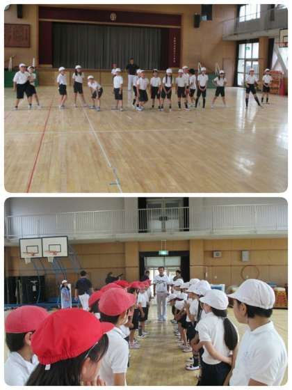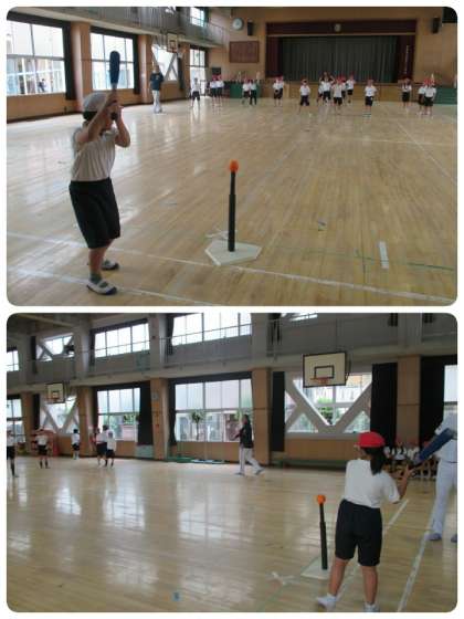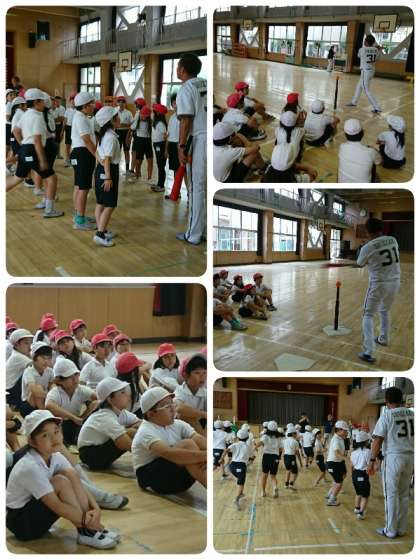 今日は、オリックス・バファローズのコーチが、4年生の子ども達にTボールゲームを教えにきてくださいました。来てくださったのは、小川 博文コーチ、塩崎 真コーチ、乾 絵美コーチ、小澤 聡コーチです。ゲームのルールを教えてもらって、さっそくTボールゲームを開始しました。