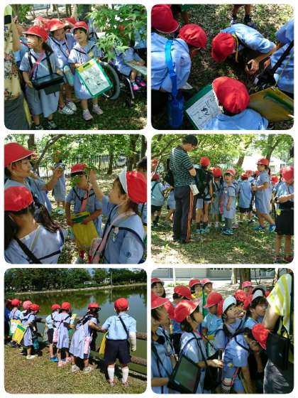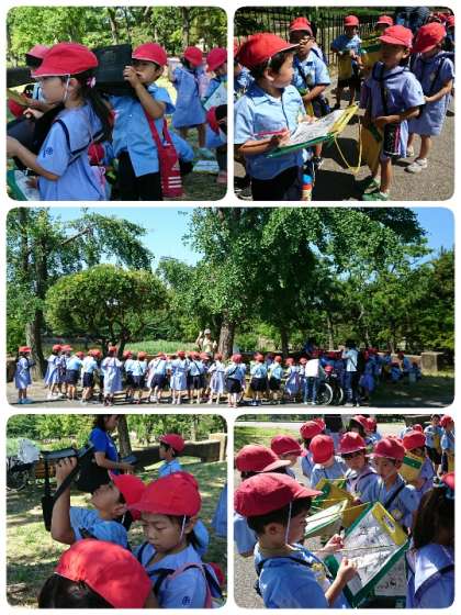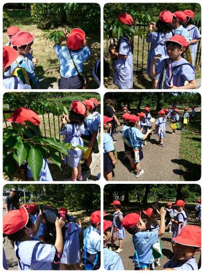 1年生が生活科の学習で、住之江公園へ出かけました。住之江公園は自然がいっぱいです。イチョウの木・サクラの木・カエデの木を見て葉っぱの形の違いを発見!!