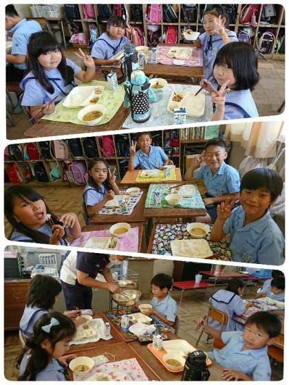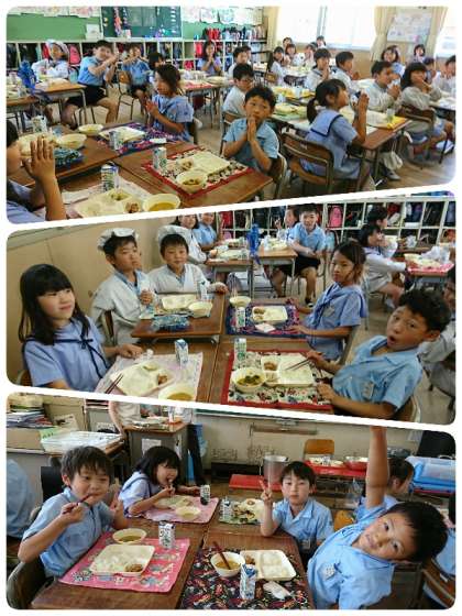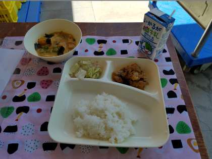 今日の給食は、ごはん、牛乳、鶏肉の甘辛焼き、みそ汁、キャベツの赤じそあえでした。鶏肉の甘辛焼きは、甘辛味がおいしく、焼き鳥丼にして食べている児童もいました。みそ汁は、かぼちゃがとけて、甘くておいしかったです。キャベツの赤じそあえは、しその香りと風味でさっぱりしていました(^-^)