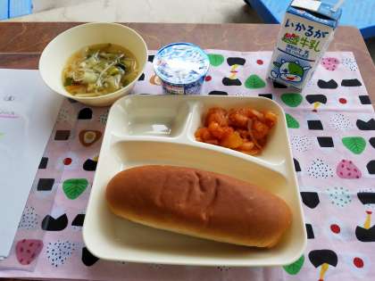 今日の給食は、パン、牛乳、えびのチリソース、中華スープ、ヨーグルトでした。えびのチリソースは、辛くなくえびがぷりっとしていました。中華スープは、野菜がたっぷりでした。ヨーグルトは、子ども達に好評でした(≧▽≦)