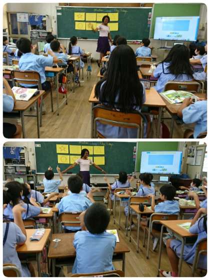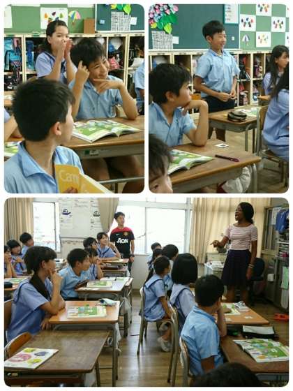 5時間目、職員室の上の教室からとても楽しそうな子ども達の声が聞こえてきたので見てきました。C−NETの先生と英語の学習をしていました。今日はいろいろな形を教えてもらっていましたが、とにかく授業がリズミカルでテンポがよく、子ども達の笑顔があふれていました。