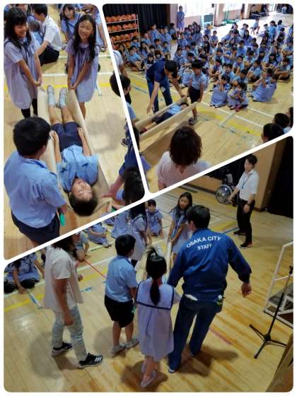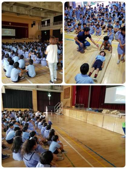 住之江消防署と区役所の方に来ていただいて、防災学習をしました。講堂では、地震後の津波について学びました。運動場では、バケツリレーと消防車見学。玄関ホールでは、煙体験をしました。子ども達は、楽しみながらも、煙の怖さ火事や地震がおこったときにとる行動などを学びました。