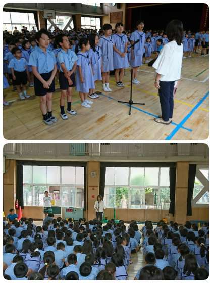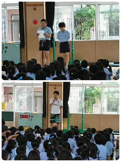 *運動委員会の委員長と副委員長が、運動場で遊ぶときや水泳学習で気をつけることについて上手にお話していました。