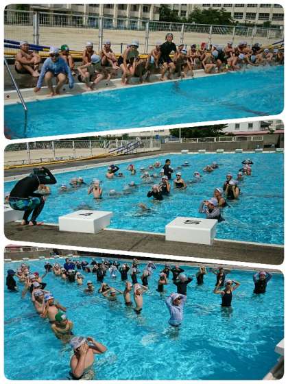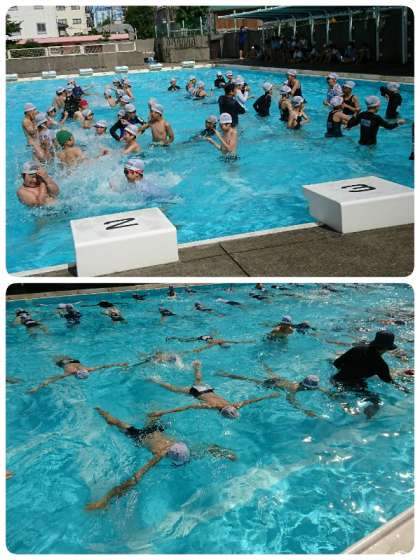 T:「頭」C:「ゴシゴシ」・・・低学年の時から身についているので、6年生でも「ゴシゴシ」の元気なかけ声が返ってきました。とても楽しそうに泳いでいました。今年はどのくらい泳力が伸びるでしょうか?楽しみですね。