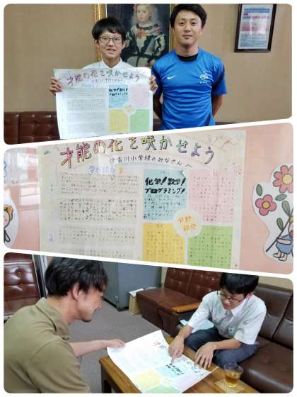本校卒業生で、現在、咲くやこの花中学校2年生の山下雄史さんが母校訪問に来ました。自作したポスターを使って、咲くやこの花中学校の魅力を説明してくれました。また、当時担任をしていた野々口先生と会い、久しぶりの出会いに会話がはずんでいました。早速、ポスターを玄関に掲示しました。ご覧ください(^^♪