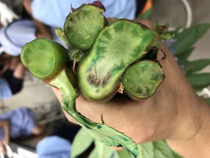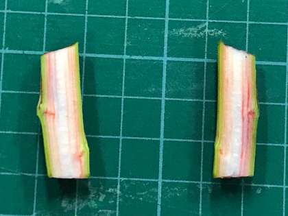 セロリやホウセンカを使って、色水の吸い上げをして、根・茎・葉の色や茎を縦や横に切って観察をしました。色水を吸い上げた道がくっきりわかりますね。子ども達は水の通り道についていろいろな予想を立てていましたが、根から吸い上げられた水は細い管のような通り道を通って、植物の体のすみずみまで行きわたることをしっかり学ぶことができました。