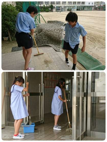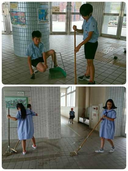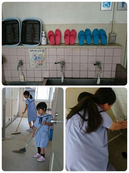 5・6年生の子ども達が、学校のあちこちでお仕事をがんばっていました。保健委員会の子ども達は、玄関ホールやトイレなどをきれいにしていました。トイレ用のスリッパもピカピカです。