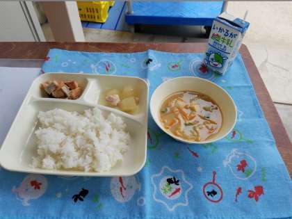 今日の給食は、ごはん、牛乳、さけのつけ焼き、みそ汁、とうがんの煮ものでした。さけのつけ焼きは、一口サイズの大きさで骨もなく食べやすかったです。みそ汁は、たまねぎ、キャベツ、にんじん、オクラなど野菜がたっぷり入っていていました。とうがんの煮ものは、とうがんが柔らかく、出汁のきいたとろみのあるあんが、かかっていておいしかったです