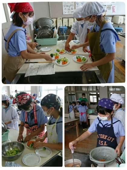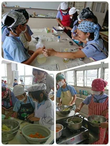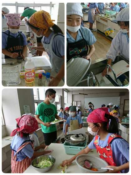 わからないことは自分から質問に来るし、グループで相談して仲よく活動できているし、見ていてハラハラする場面もたくさんありましたが、和気あいあいと調理している5年生の子ども達は実に微笑ましいです。「野菜サラダ」、お家でもぜひ作ってもらってくださいね。