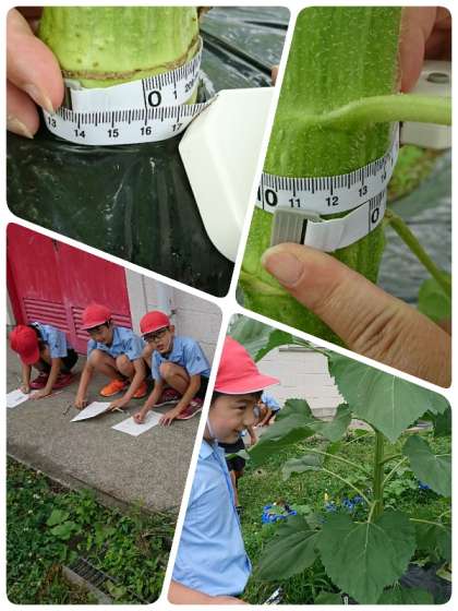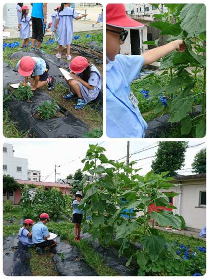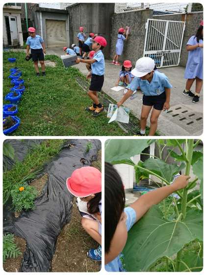 3−3の子ども達が、学習園で植物の観察をして記録カードをかいていました。すくすく大きく育っているヒマワリや花が咲いているマリーゴールドなどを観察していました。