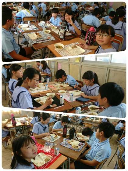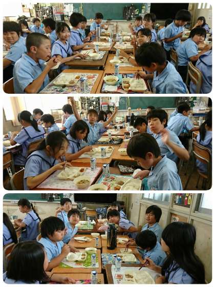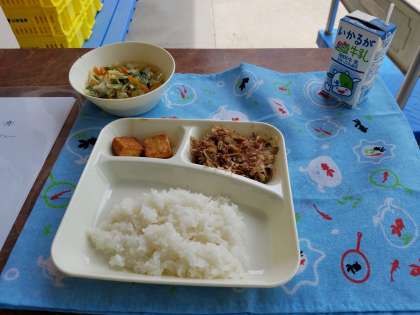 今日の給食は、ごはん、牛乳、ゴーヤチャンプルー、すまし汁、あつあげのしょうがじょうゆかけでした。ゴーヤチャンプルーは、ゴーヤが小さく切って合って、苦手な児童もたべやすかったです。すまし汁は、キャベツ、たけのこ、にんじん、だいこんばなど野菜がたっぷり入っていました。あつあげのしょうがじょうゆかけは、しょうがじょうゆが厚揚げに合っていて、おいしかったです(^○^)