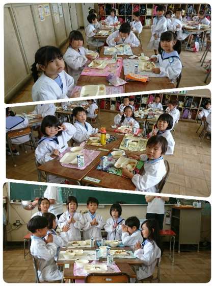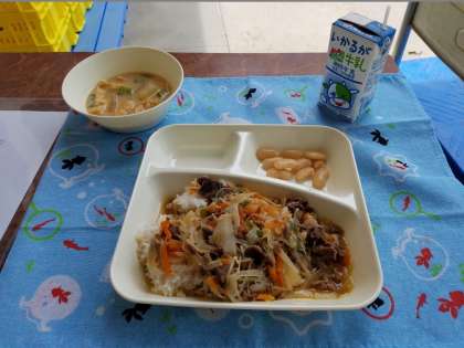今日の給食は、ごはん、牛乳、牛丼、とうがんのみそ汁、大福豆の煮ものでした。牛丼は、子ども達に大好評でした。とうがんのみそ汁は、とうがんが柔らかくておいしかったです。大福豆の煮ものは、とても甘かったです(*´▽`*)