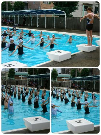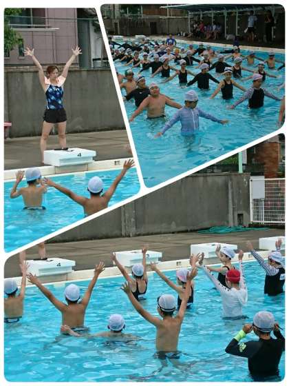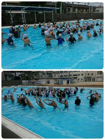 プールに入っている6年生全員が音楽に合わせて動いていきます。カウントをしっかり聞きながらどんどん動きが増えていきました。子ども達もふりを覚えようと一生けんめい。とても楽しそうに活動していました。最後には子ども達の動きがそろってきて、びっくりするほど上手になっていました。子ども達も納得の笑顔でした。