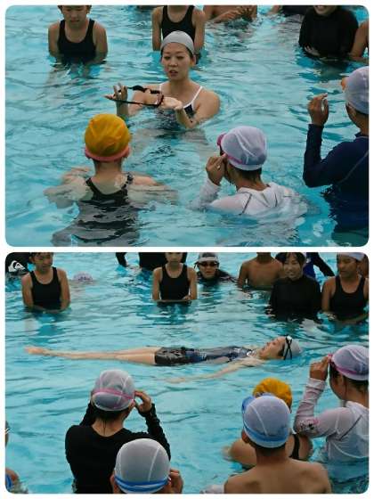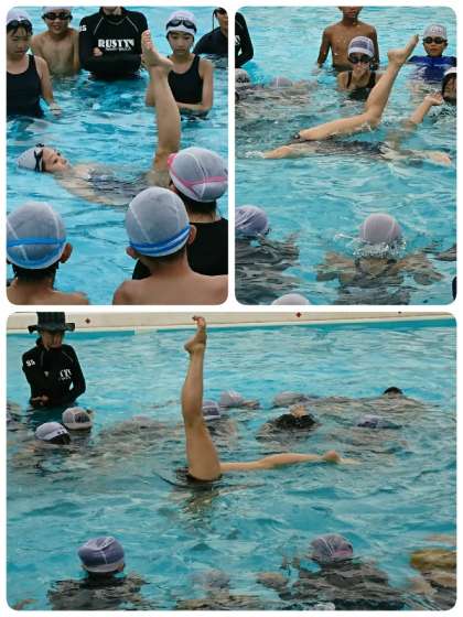 模範演技も見せていただきました。まっすぐ浮くときや、そのままの姿勢でぐんぐん進む手のかき方を教えてもらいました。水に潜って間近に動きをみることができ、子ども達は驚きの表情でした。