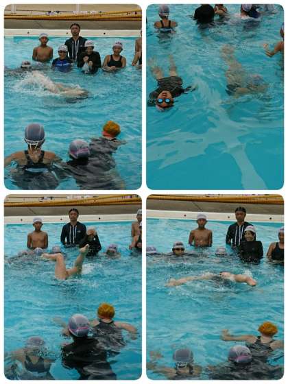 長い時間ずっと潜ったままで足を上にして方向を変えたり、ものすごいスピードで回転したり、本物の一流選手の演技を目のあたりにした子ども達は大きな歓声をあげていました。