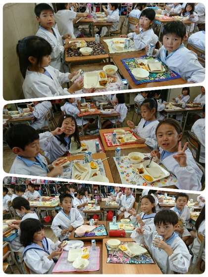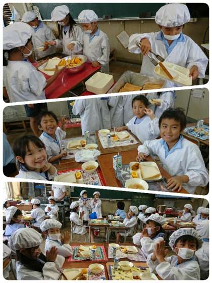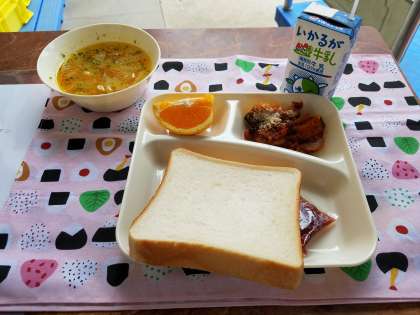 今日の給食は、パン、牛乳、かぼちゃのミートグラタン、スープ、オレンジ、いちごジャムでした。かぼちゃのミートグラタンは、かぼちゃが甘くて、柔らかく、子ども達に好評でした。スープは、キャベツなどの野菜がしんなりとしていて、おいしかったです。オレンジは、ほどよい酸味と甘みがありました(^.^)
