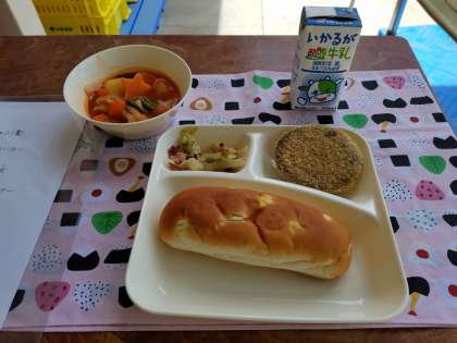 今日のメニューは、チキンレバーカツ、ケチャップ煮、たことキャベツのソテー、サツマイモパン、牛乳でした。チキンレバーカツはサクッとあがり、カレー風味でとてもおいしかったです。ケチャップ煮はケチャップ味がしっかりしていたので子ども達もパクパク食べていました。たことキャベツのソテーはキャベツが甘くて、タコの風味がしっかり出ていていました。今日もおいしくいただきました。