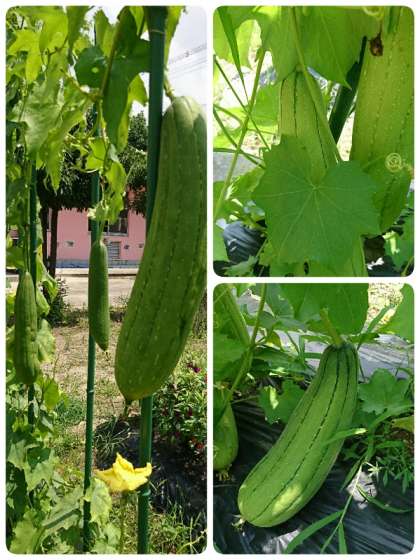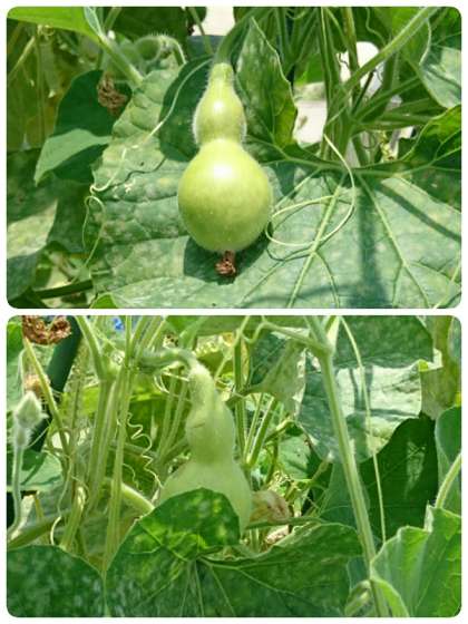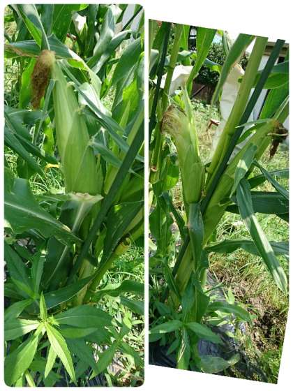 この写真は上からヒョウタン、ヘチマ、トウモロコシです。トウモロコシはとても太くなっています。中身は育っているかな?