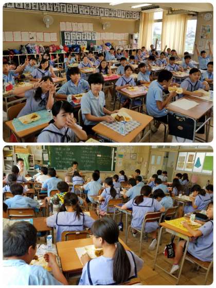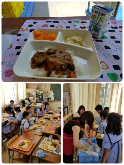 今日の給食は、ごはん、牛乳、夏野菜のカレーライス、キャベツのサラダ、みかん(缶)でした。夏野菜のカレーライスは、かぼちゃやなすが入っていて、子ども達に大好評でした。キャベツのサラダは、あっさりとした味でした。みかん(缶)は、甘くてジューシーでした(^^♪