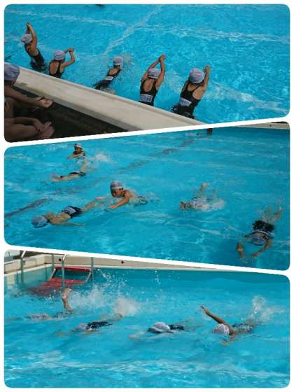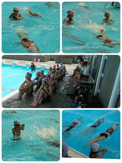 けのびの練習では、もぐって壁を蹴ることを意識して練習しました。強く壁を蹴るとぐんとスピードが出てまっすぐのきれいな姿勢になります。その感覚をつかんだ子ども達は5m以上スーッと流れるように進んでいました。気温も水温も上がると子ども達の動きがいきいきしてきますね。話を聞くときの姿勢も素晴らしいです。