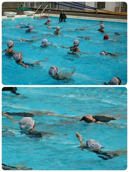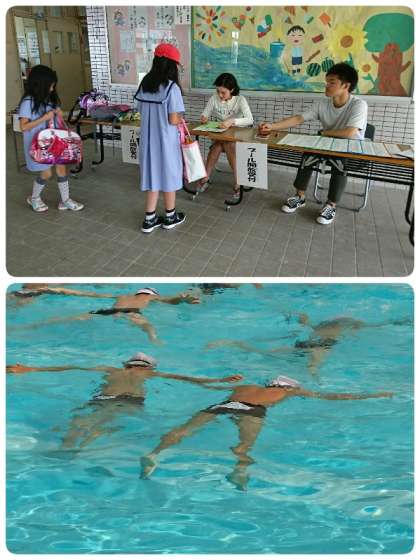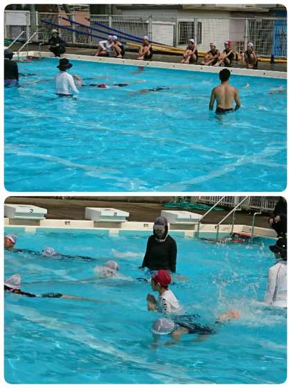 今日も朝からたくさんの子ども達が水泳の特練に参加しています。昨日で目標が達成できた子ども達は、今日はお休み。たくさんの先生達が、子ども達を励ましながら息つぎの仕方や手のかき方、キックの仕方など、丁寧に教えていました。みんな真剣に練習に励んでいました。