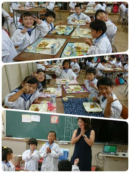 2学期最初の給食は、ごはん、牛乳、ビーフカレーライス[米粉]、野菜のピクルス、みかんゼリーでした。ビーフカレーライス[米粉]は、子ども達に好評で、おかわりに列を作っていました。野菜のピクルスは、酸味が強すぎず、おいしかったです。みかんゼリーは、冷たくて甘かったです (^O^)/