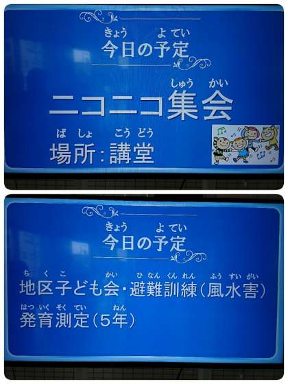 5時間目に地区子ども会を行います。その後、風水害を想定した避難訓練として集団下校をします。14:35ごろに学校を出る予定です。