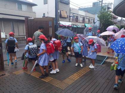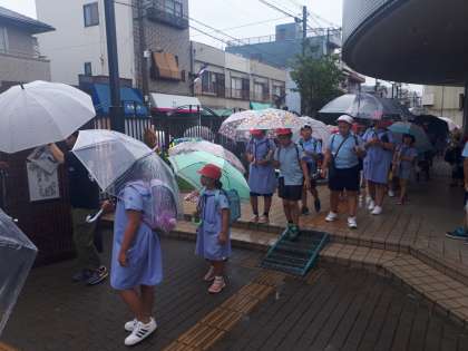 台風などでの風水害を想定した避難訓練を行いました。地区子ども会に分かれた後、各班で集団下校をしました。